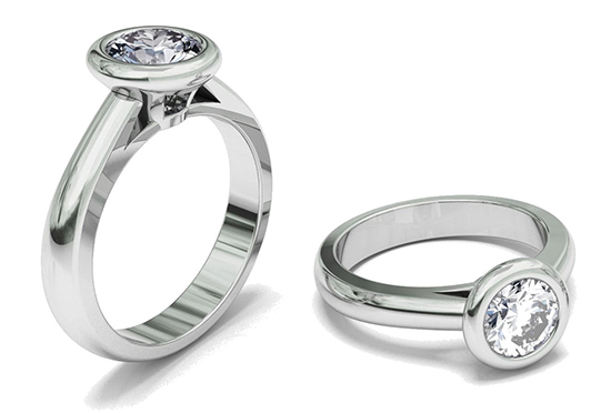 A Bezel setting is when a diamond is completely surrounded by metal. It can wrap all the way around the stone or only partially surround it, depending on the style of the ring. This type of diamond ring setting is good for protecting the girdle and often makes the stone look larger. The bezel setting is often used with round shaped diamonds, but also works well with other diamond shapes.